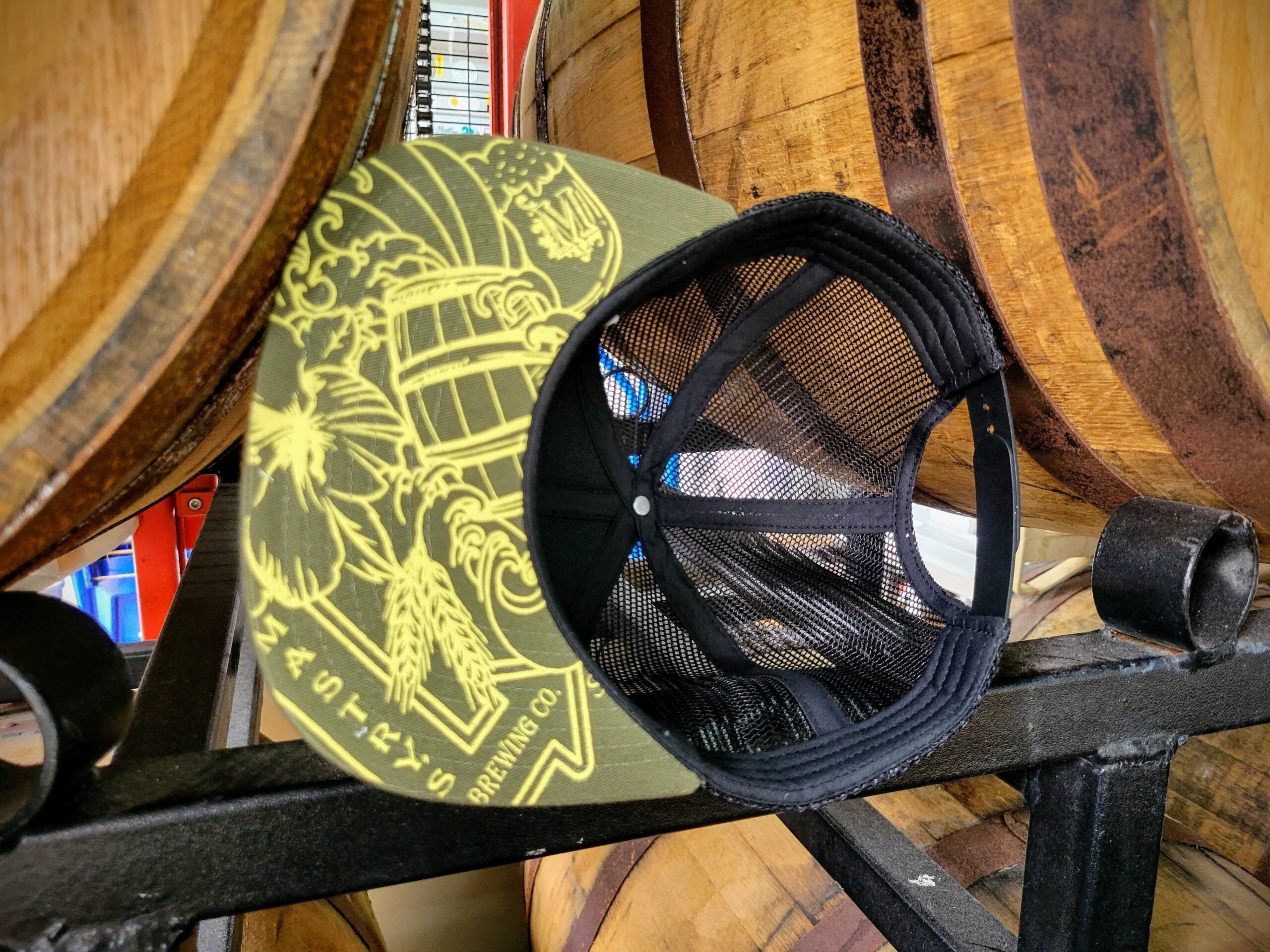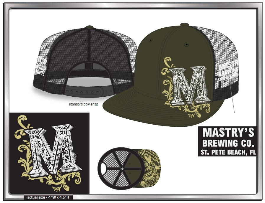 The new snap back Embroidered M hat with screen printed collage under the bill. Available in Black/White or Green/Black.